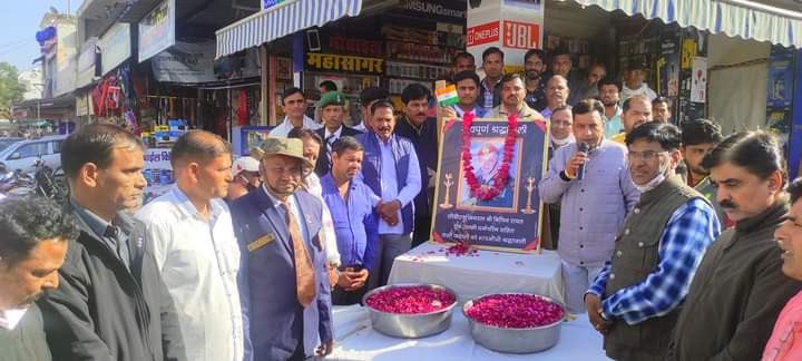 गुलाबपुरा (रामकिशन वैष्णव) देश के पूर्व सेना प्रमुख, सीडीएस जनरल विपिन रावत व उनकी पत्नी एवं सैन्य अधिकारियों के हैलीकॉप्टर हादसे में निधन हो जाने पर स्थानीय वीर सावरकर चौराहे पर जनप्रतिनिधियों व गणमान्यजनों ने भावभीनी श्रद्धांजलि अर्पित कर नमन किया व सीडीएस जनरल विपिन रावत अमर रहे के नारे लगते हुए सभी ने पुष्पांजलि अर्पित की गई! इस दौरान प्रधान कृष्णा सिंह राठौड़, पूर्व चेयरमैन धनराज गुर्जर, पालिका उपाध्यक्ष एडवोकेट सावरनाथ योगी, पार्षद रामदेव खारोल, हेमंत कुमार, पूर्व कैप्टन हमीद मो., पूर्व सूबेदार जीएल यादव, रिधकरण, राजमल पूर्व हवलदार रणजीत सिंह, गोवीनद, रामदयाल, किशोर राजपाल, अमित आत्रेय, इन्द्रजीत सिंह, हरिश शर्मा, रघुवीर वैष्णव, ओम दाधीच, जीवतराम मेठानी, दीनदयाल गुर्जर, राजेन्द्र सिंह, अक्षय कुमार चौधरी सहित कई शहरवासी मौजूद थे!